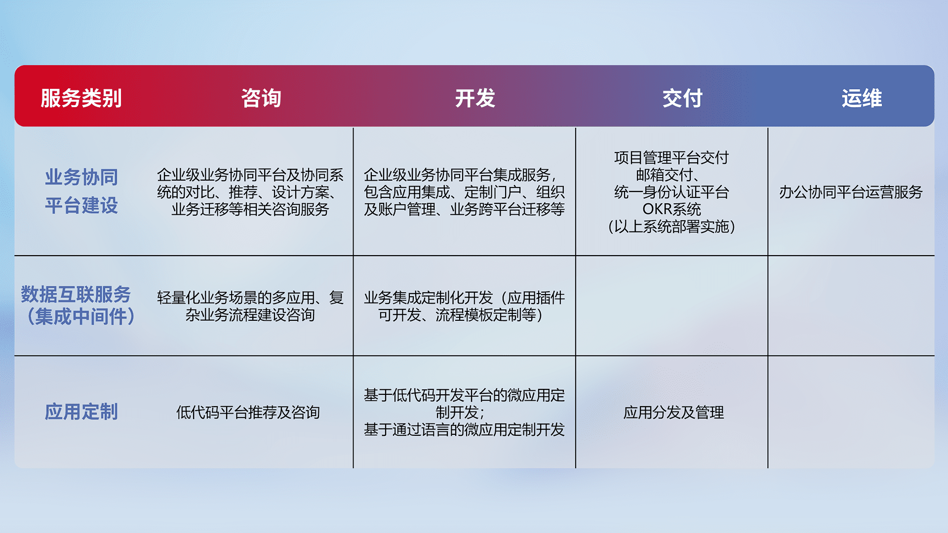 针对钉钉、、企微、、、IDaas等平台级产品提供产品的规划、、、、方案、、、、交付、、定制化开发等服务,,,,实现如统一协同办公、、、、智能客户服务、、、、混合会议管理、、、智能数据查询、、等业务场景,,,,实现数字化转型。。。