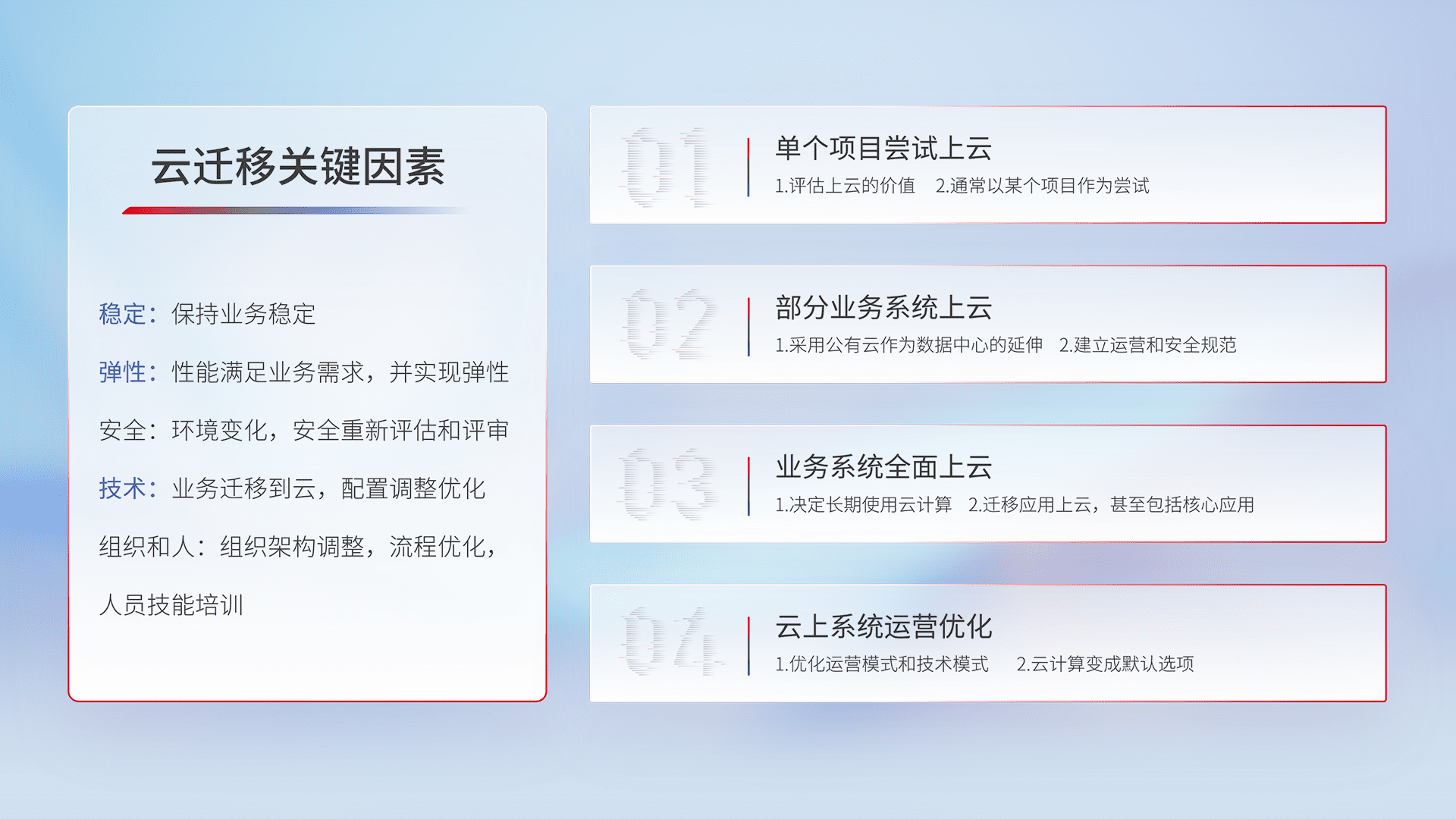 结合实际业务,,从规划设计、、、、云平台选型、、云原生改造、、数据迁移、、、、集成交付,,迁移全过程为客户识别最佳上云路径,,,做好风险识别管理,,,设计网络架构、、、、身份权限、、安全审计合规、、操作审计、、日志审计、、、监控告警策略、、、、多站点容灾设计等,,,,对云上基础设施进行整体规划,,,提升IT治理水平,,以满足弹性、、高可用、、、高性能的需求。。。